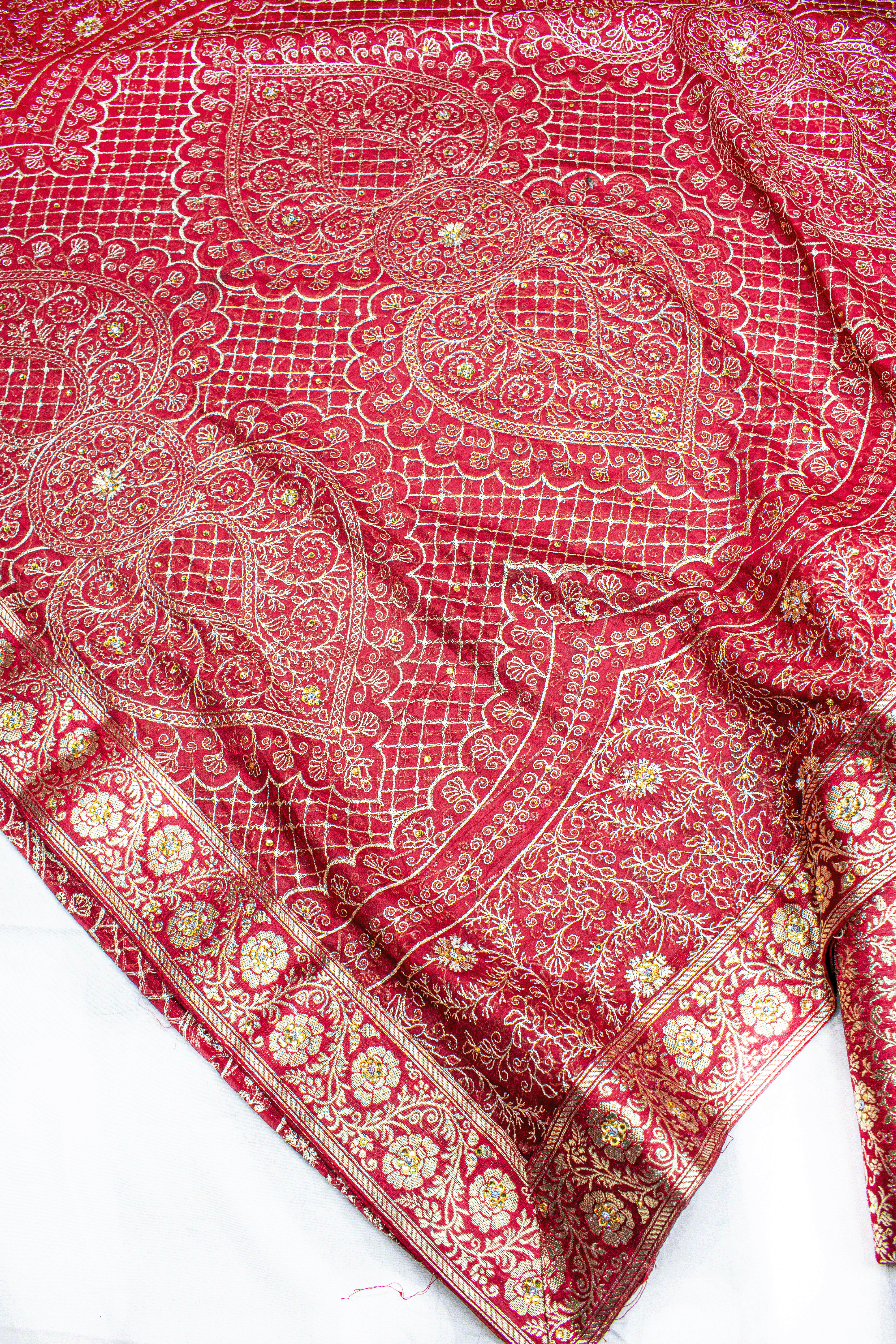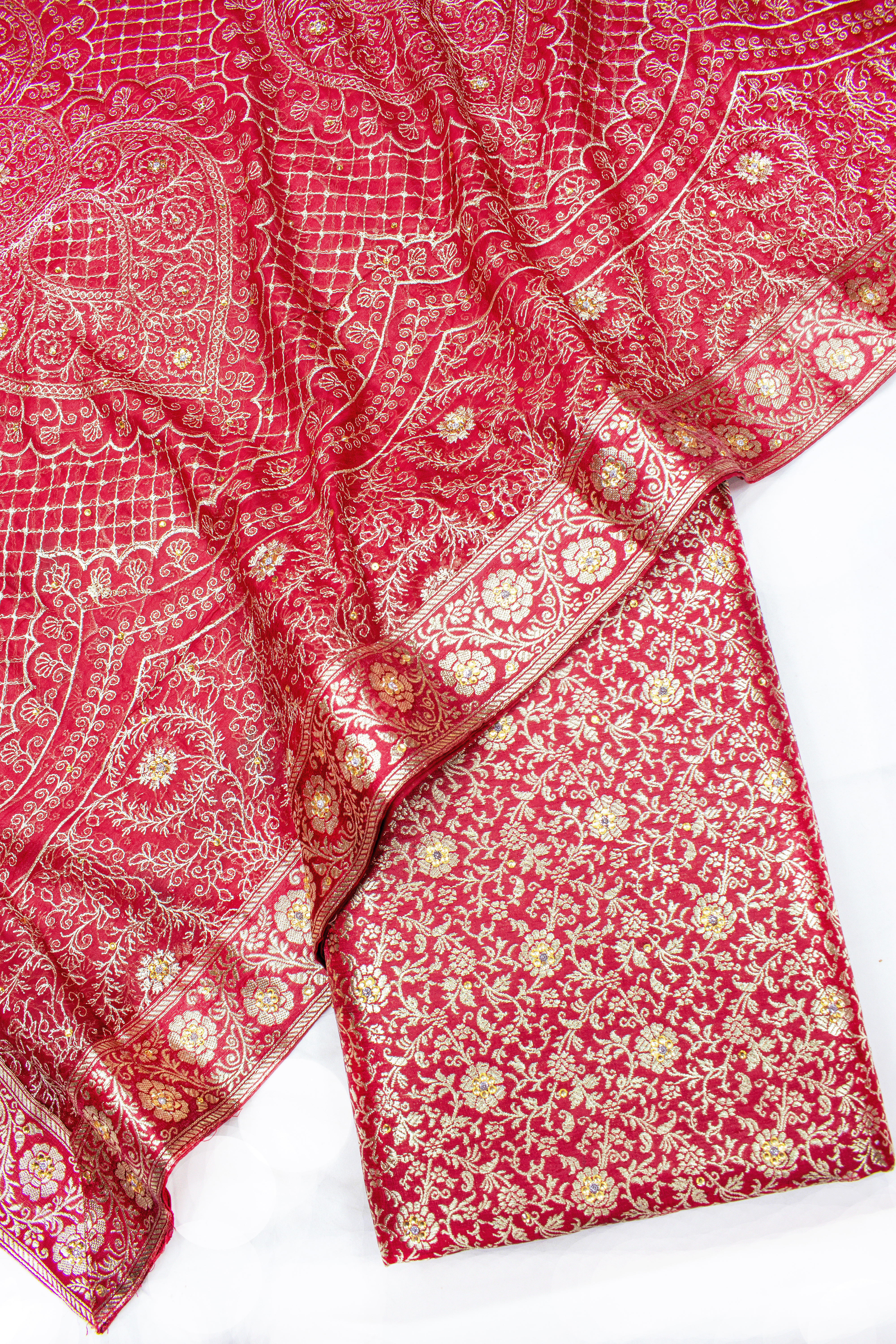 Introducing our Maroon stone Banarasi Gharara – a fusion of timeless tradition and modern elegance. This ethereal ensemble encapsulates the rich heritage of Banaras while embracing contemporary sensibilities, resulting in a mesmerizing attire that stands as a true work of art.