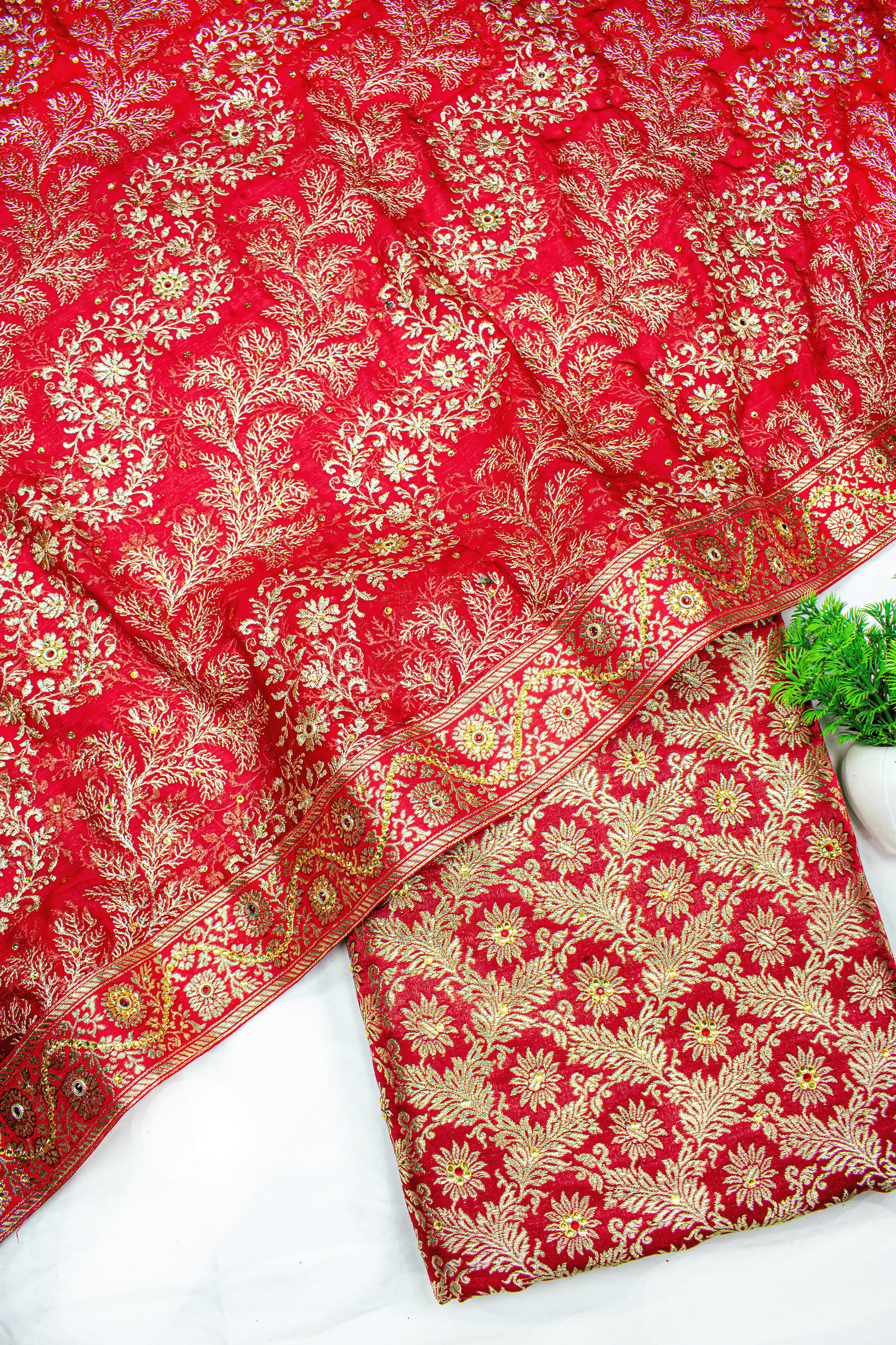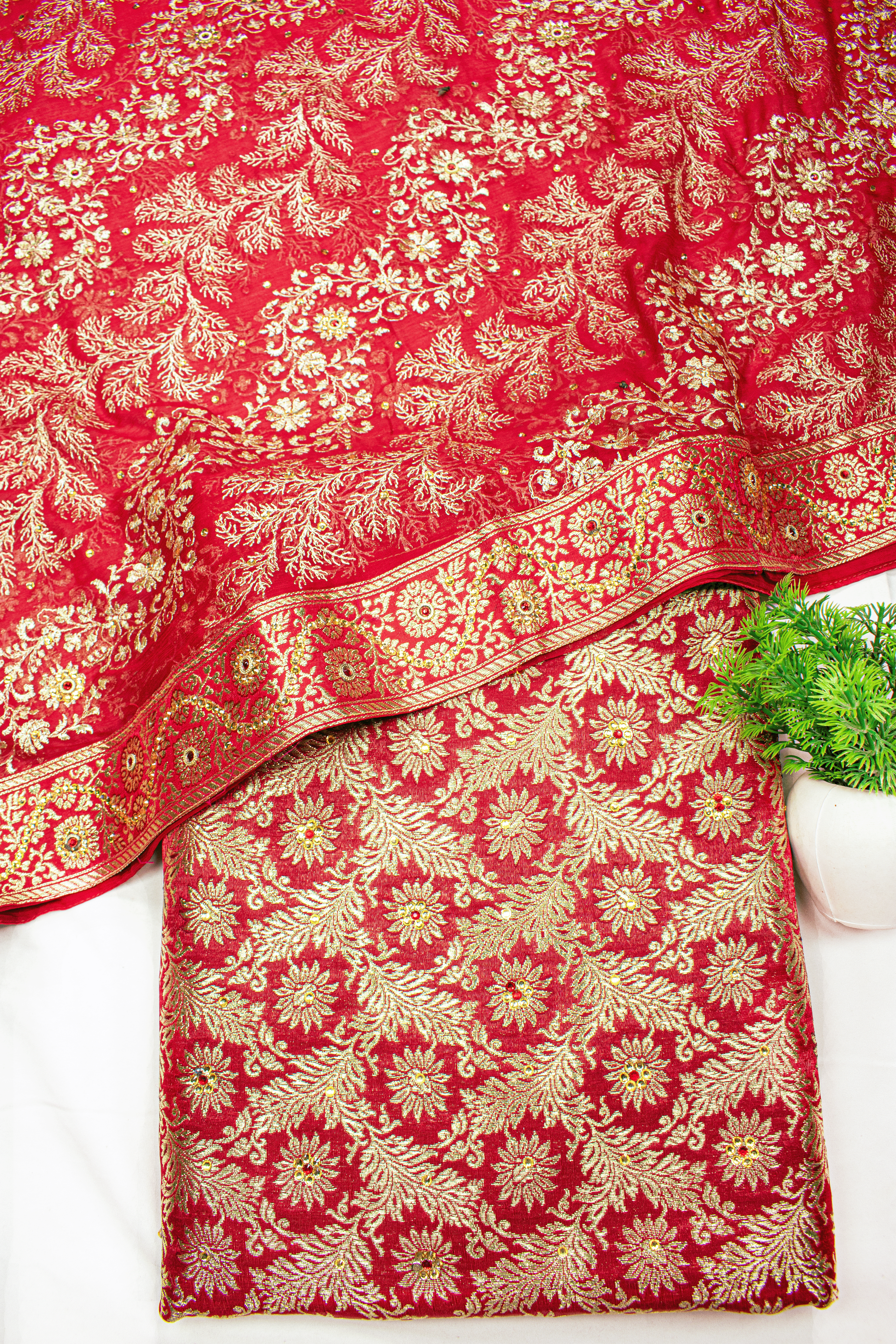 This Red Stone Work Kimkhab Silk Banarasi Gharara is ideal for special occasions. Richly woven with intricate details, it is sure to capture the light and turn heads. Made with 100% pure silk, it is extremely comfortable and exudes luxury.
